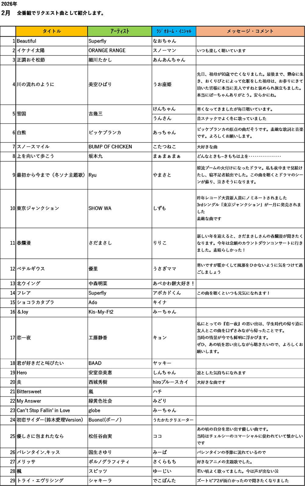 ③リクエストされる方の偏り防止のため、各月お一人のリクエストは別アーティストで2曲迄の採用とします。